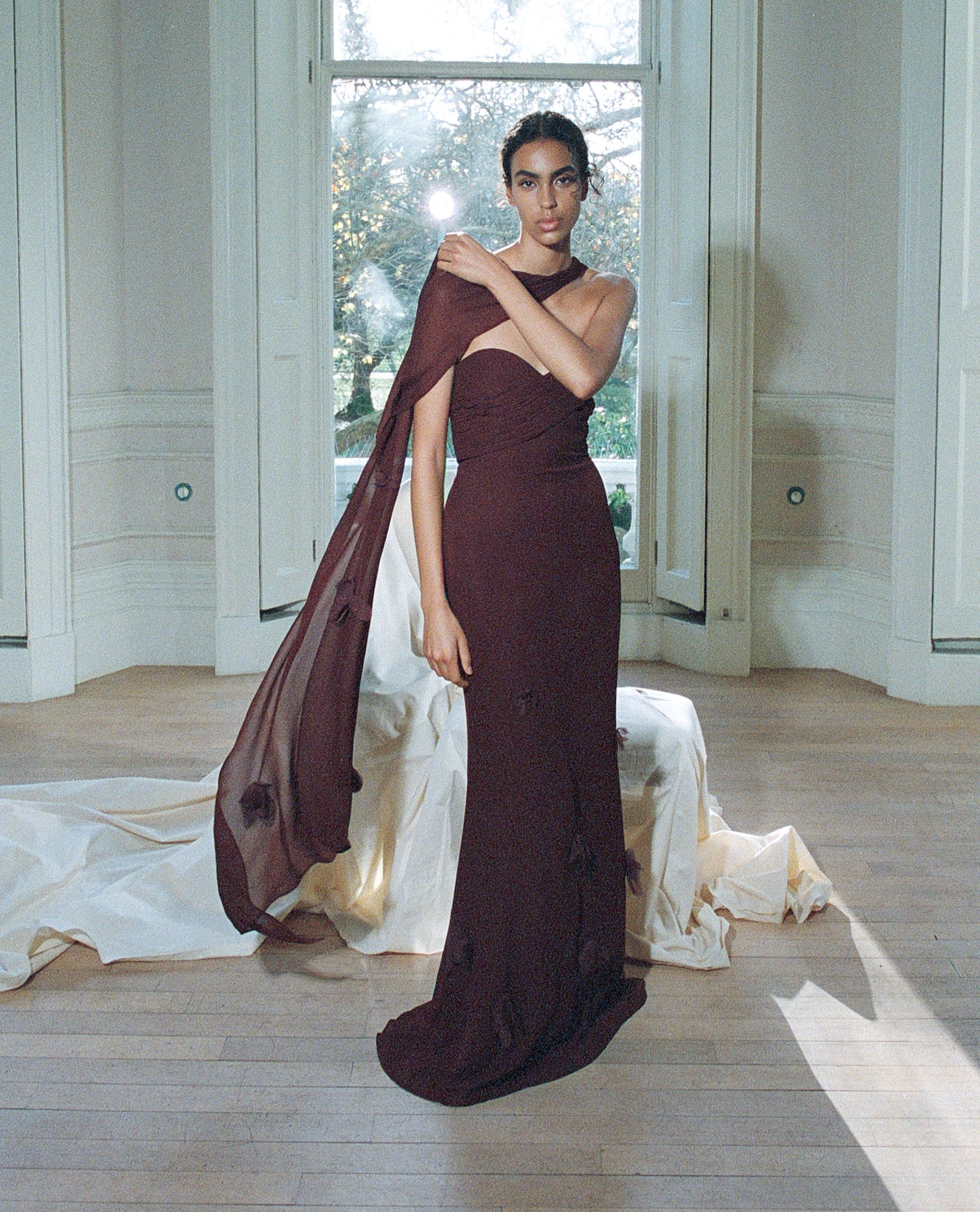 Shimmering gowns and iridescent fabrics catch the light, sculpting radiant silhouettes for glamorous affairs. Soft yet structured, precise pleats and feather trims embrace the body with intricate, sophisticated detail. New-season shapes explore fluid draping and dramatic cape accents— a modern nod to old time glamour.