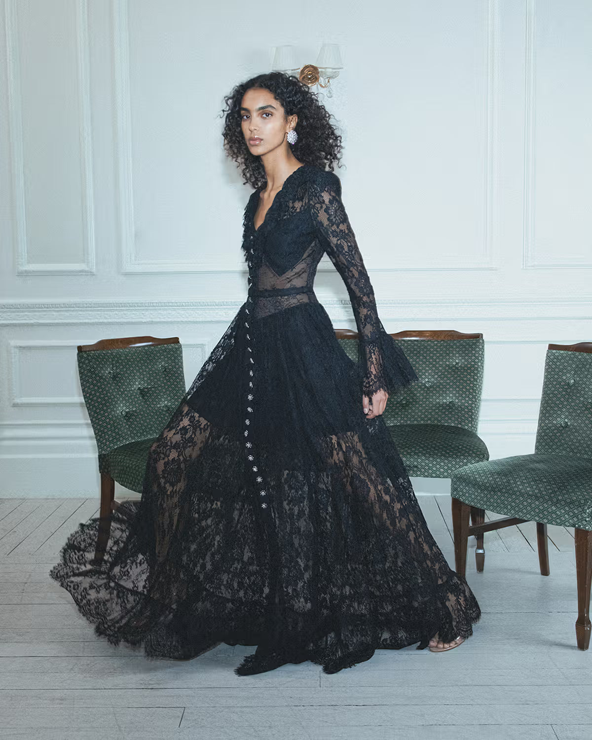 SHIMMERING GOWNS AND IRIDESCENT FABRICS CATCH THE LIGHT, SCULPTING RADIANT SILHOUETTES FOR GLAMOROUS AFFAIRS. SOFT YET STRUCTURED, PRECISE PLEATS AND FEATHER TRIMS EMBRACE THE BODY WITH INTRICATE, SOPHISTICATED DETAIL. NEW-SEASON SHAPES EXPLORE FLUID DRAPING AND DRAMATIC CAPE ACCENTS— A MODERN NOD TO OLD TIME GLAMOUR.