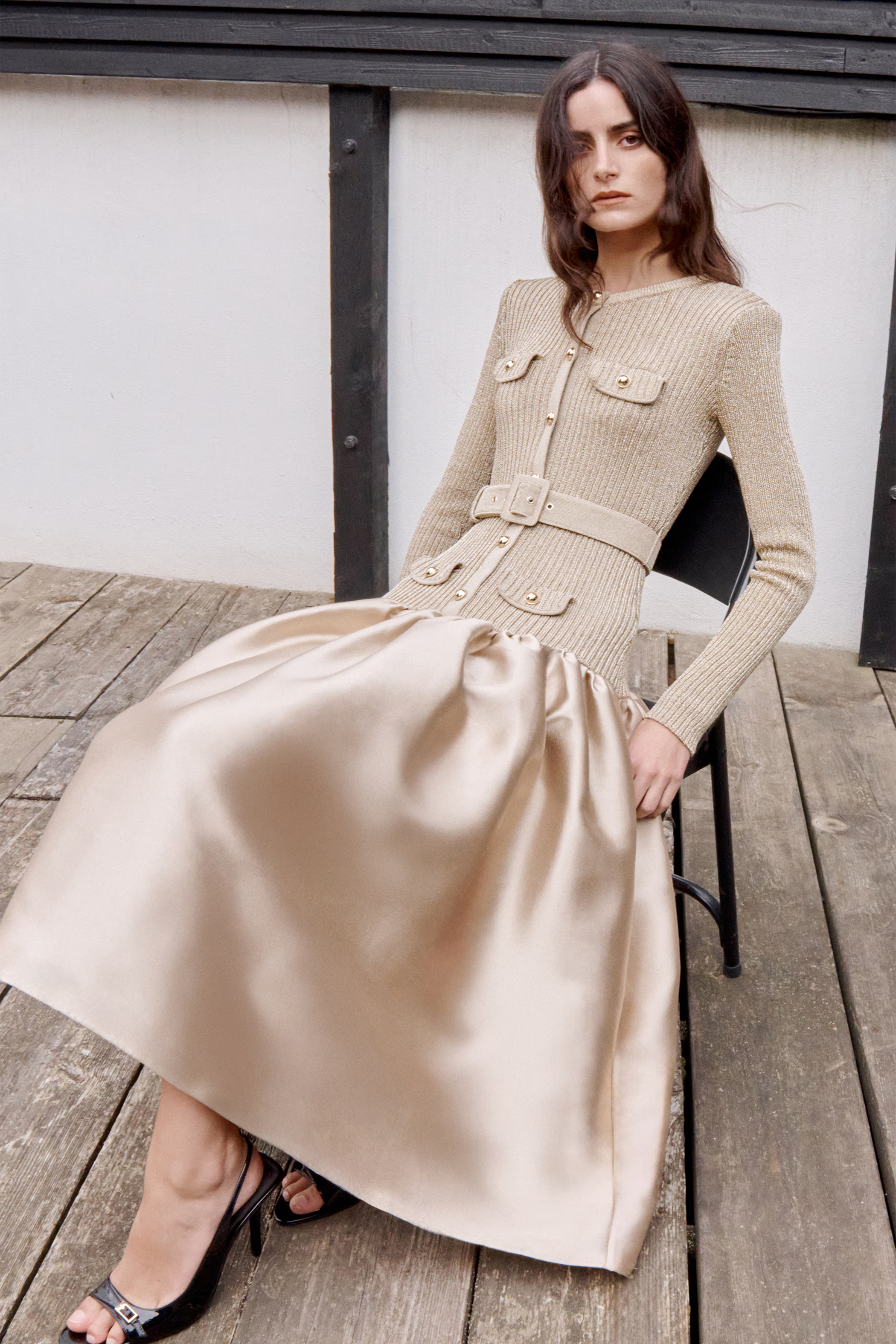 Gold Knit Taffeta Midi Dress