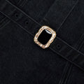 Statement mottled gold and black buttons add charming hardware to this black denim mini dress. Lean into its bandeau neckline and flirty, flared hem – style with sky-high heels for a hot date.
